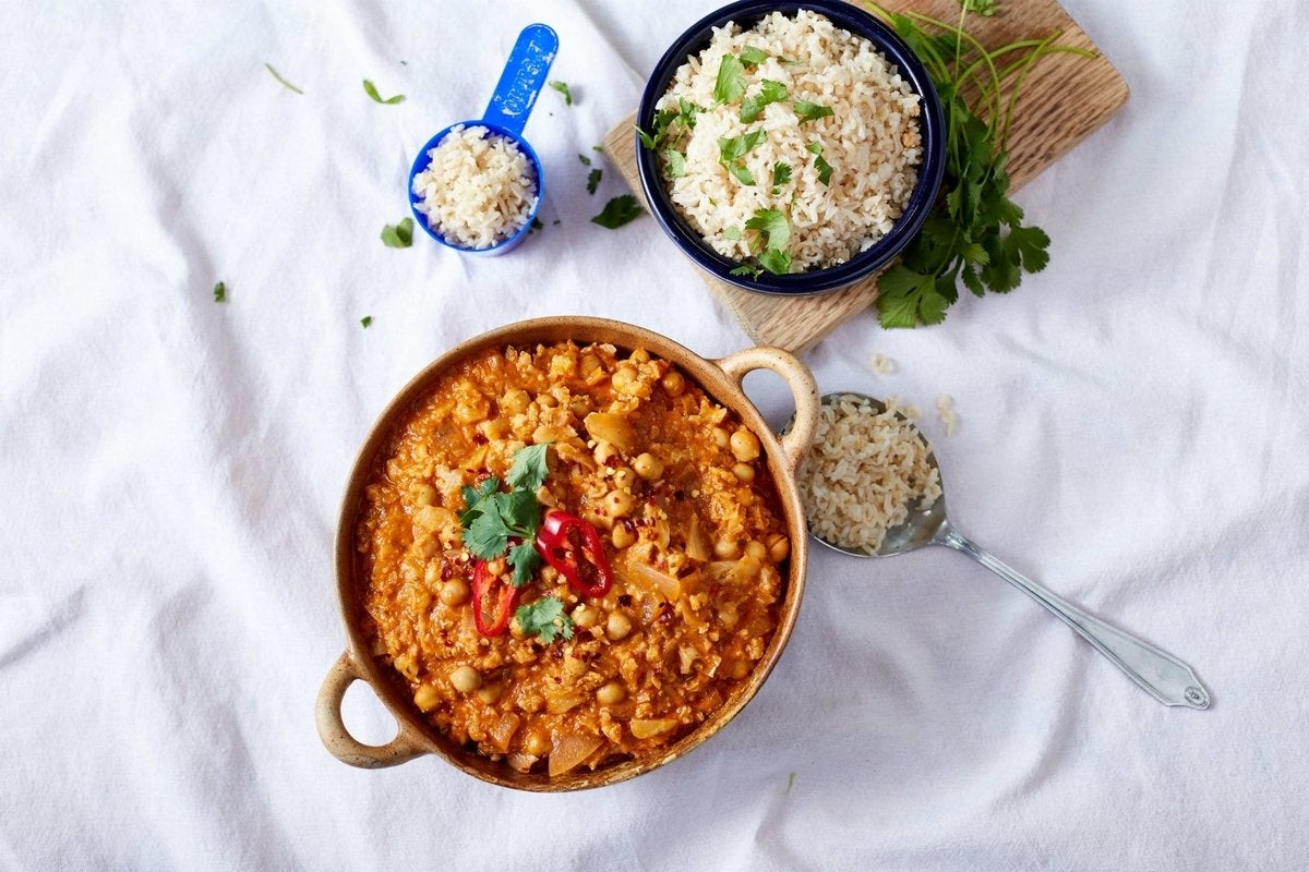 4. Serveer met volkoren rijst, een klodder zuivelvrije yoghurt en een scheutje limoensap.