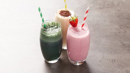 1) Voeg eenvoudig al je ingrediënten toe aan een blender en blitz tot een glad en klontervrij mengsel. Geniet direct of schenk in een shaker om onderweg mee te nemen.