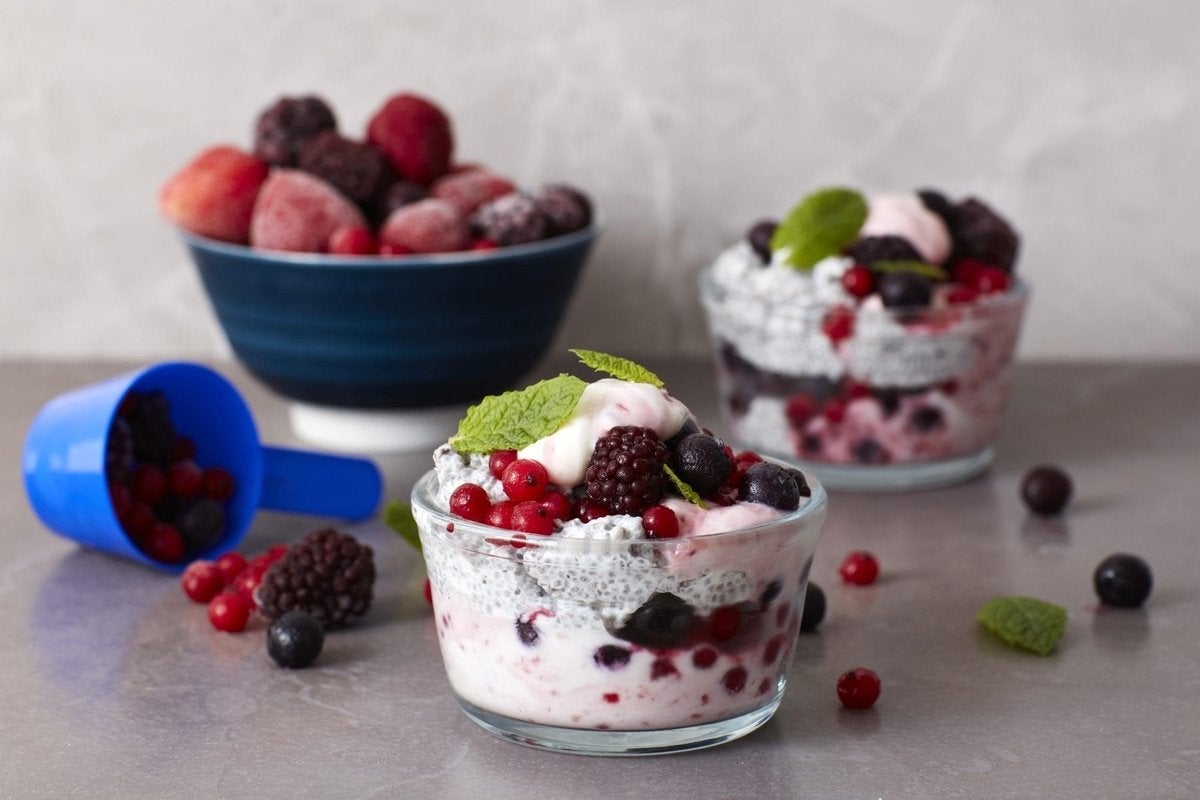 Lepel chiapudding over de bovenkant van het bevroren bessenmengsel en bevries gedurende 15 minuten.
