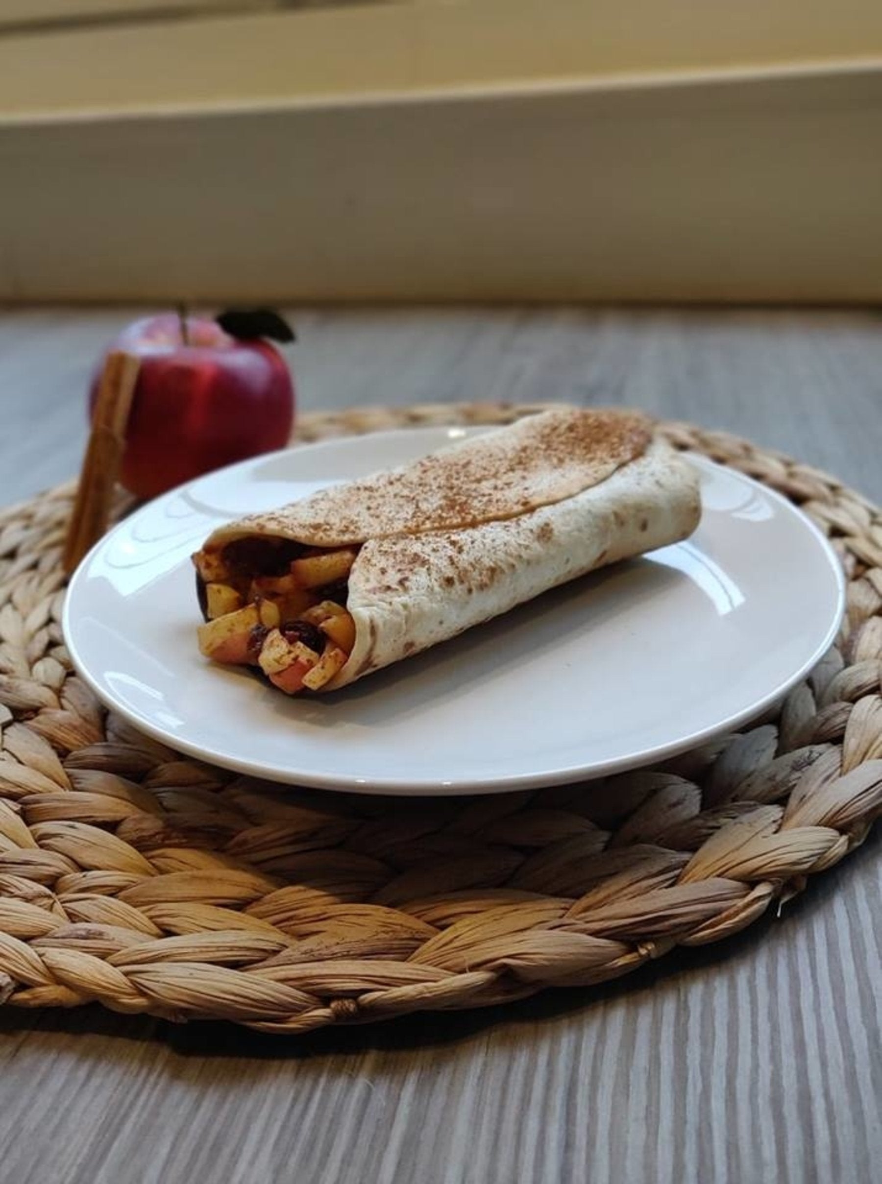 - Verdeel het appelmengsel over het midden van de wrap, vouw deze in een driehoek en leg ze op een bakplaat met bakpapier.