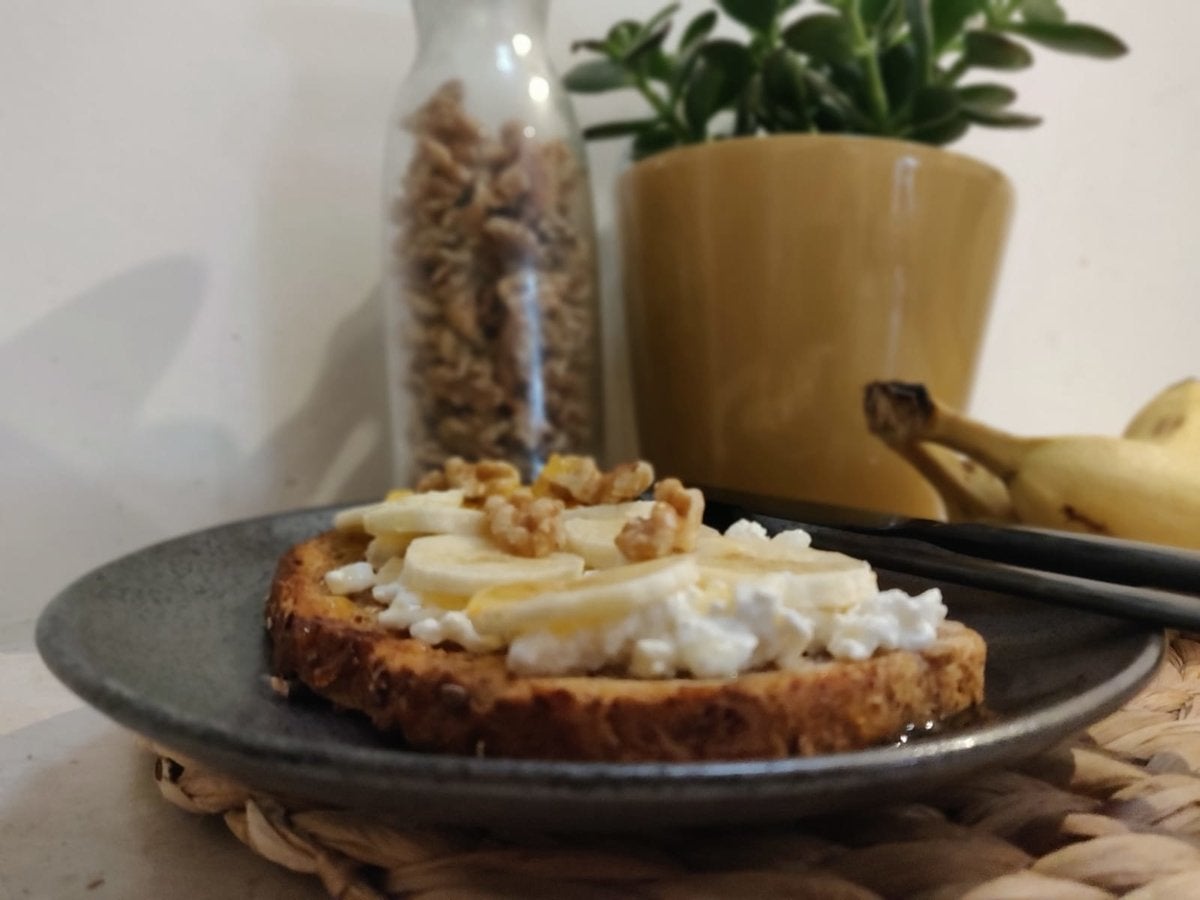Banaan kan je bij veel gerechten toevoegen, ook op brood. De bekende variant hiervan is natuurlijk de toast met banaan en pindakaas, maar wat dacht jij van hüttekäse, banaan, walnoten en honing op je toast? Bij mij zijn ze nu beide favoriet, pindakaas levert je gezonde vetten op en hüttekäse wat extra eiwitten.
