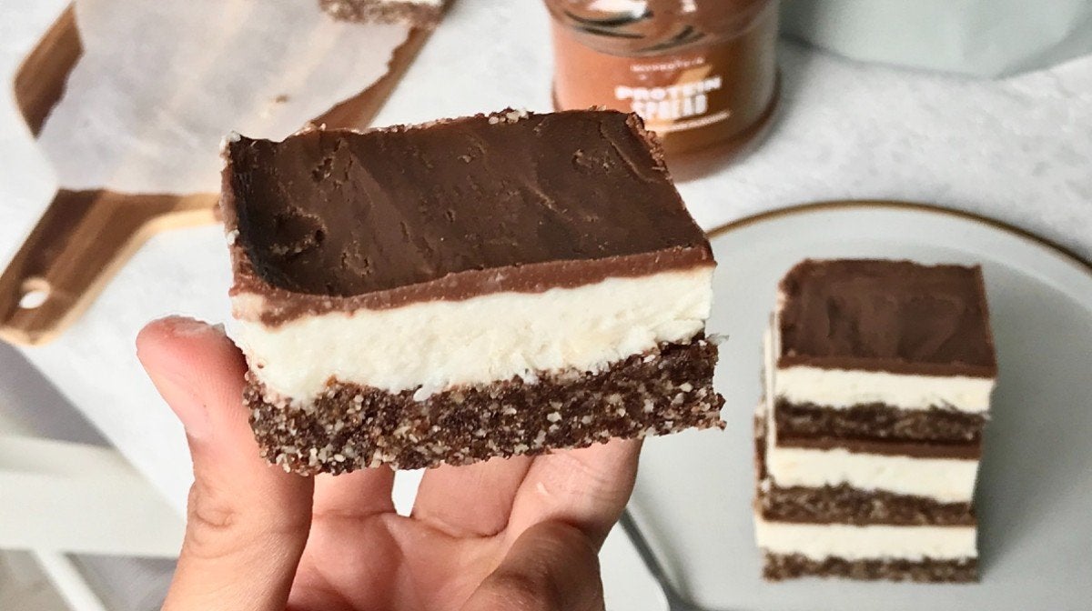 6) Giet de gesmolten chocolade Protein Spread over de bevroren kokosyoghurtlaag en strijk glad zodat deze gelijkmatig bedekt is. Zet 1 uur in de vriezer.