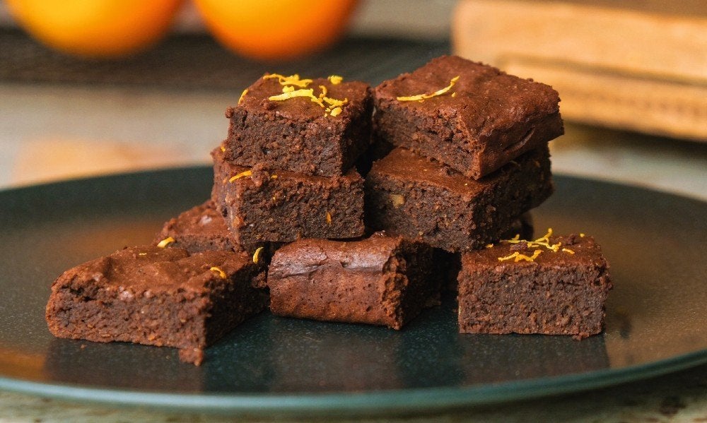 De chocolate orange brownies van Niall Kirkland zijn eenvoudig om te maken en de resultaten zijn het meer dan waard. Hij gebruikt veel pure chocolade met sinaasappelsmaak en cacaopoeder om ze een rijke, diepe smaak te geven, samen met ahornsiroop om op natuurlijke wijze te zoeten en wat sinaasappelschil voor een frisse citruspunch. Hemels.