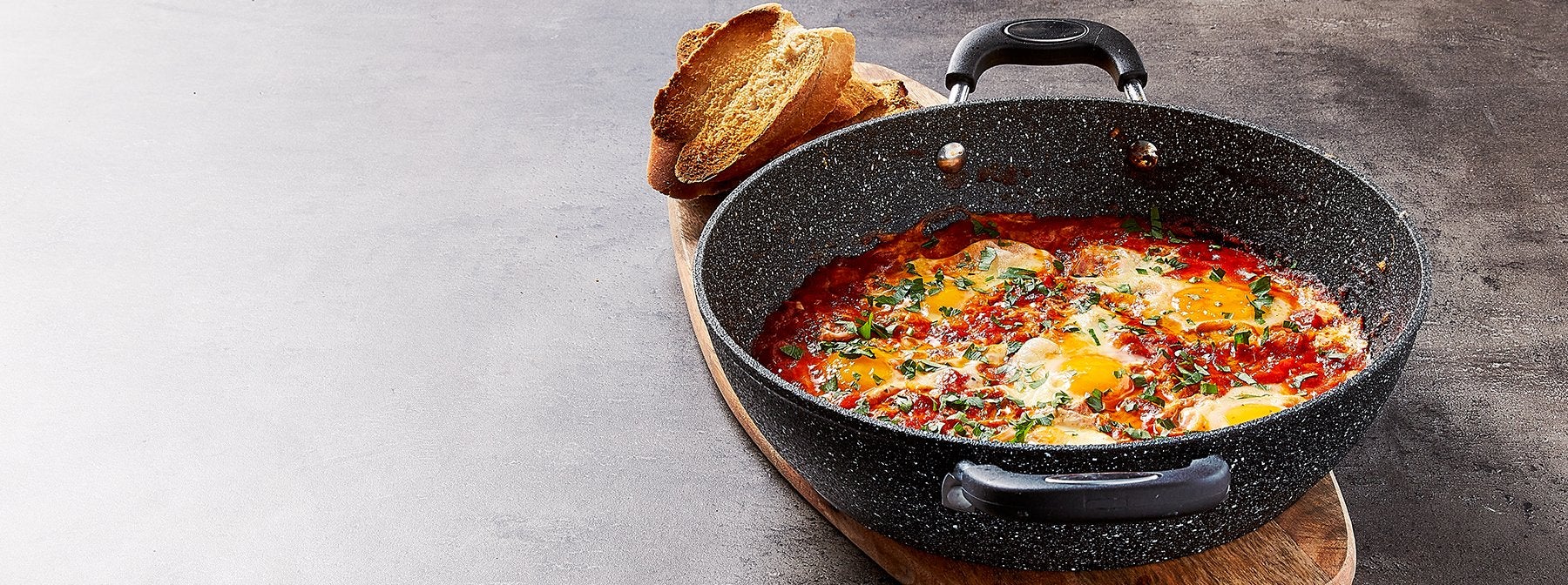 Shakshuka is een traditioneel mediterraan gerecht van gepocheerde eieren in een rijke saus van tomaten, olijfolie, paprika, ui en knoflook. We denken dat het een absolute winnaar is voor elke maaltijd van de dag - of je nu een sneetje knapperig brood eet tijdens de brunch of een bijgerecht serveert voor het avondeten.
