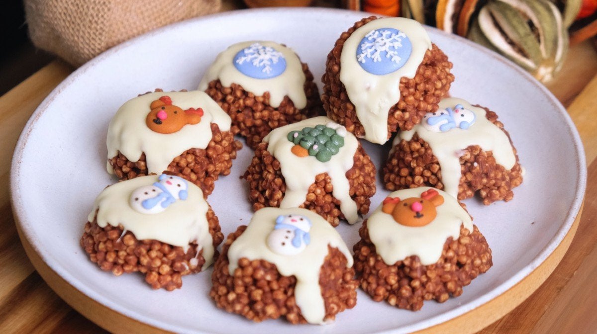 3. Eenmaal klaar, verwijder je de knapperige traktaties uit de muffinvormpjes en leg je ze ondersteboven op een bord. Voeg een theelepel gesmolten witte chocolade toe op elke knapperige traktatie en werk af met een kant-en-klare kerstversieringen. Zet nog 30 minuten in de koelkast om de witte chocolade te laten stollen en geniet ervan!