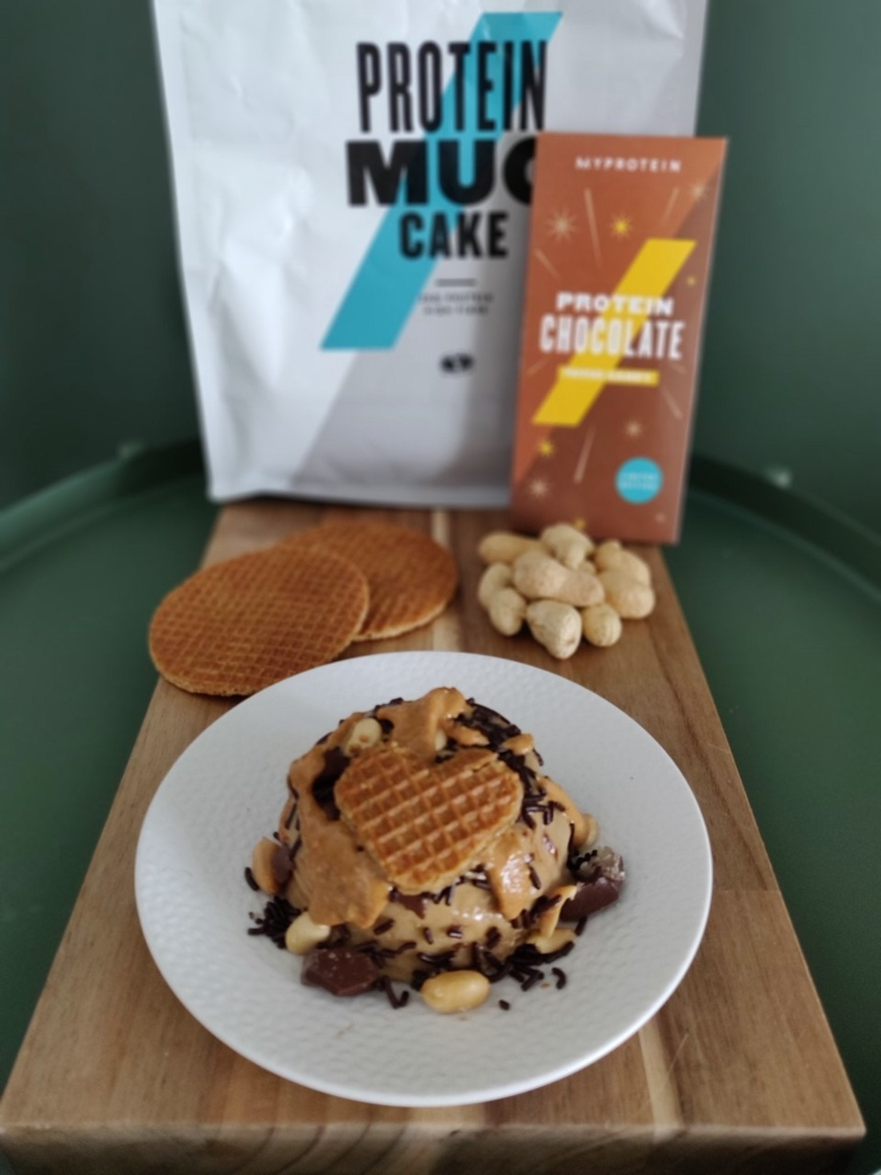 Bereid vervolgens de Mugcake Salted Caramel zoals op de verpakking staat (Voeg 50 gram mugcake mix toe aan een mok, voeg water of melk toe 70ml en verwarm dit 40-50 seconde in de magnetron). - Laat de Mugcake 30 seconde in de mok voordat je hem op het bordje legt. In deze 30 seconde verwarm je ondertussen de pindakaas in een bakje in de magnetron, zodat deze al gesmolten is.