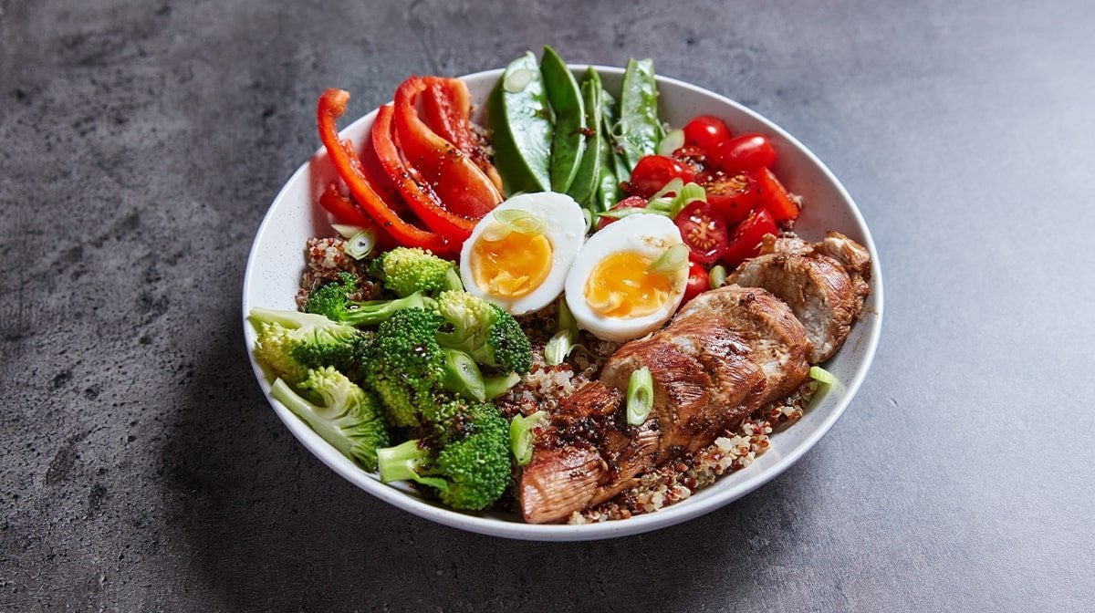 - Bouw je protein bowl. Maak een basis van quinoa en voeg dan de gekookte broccoli en peultjes toe, samen met plakjes rode paprika en cherrytomaatjes. Voeg de gesneden kipfilet en het gekookte ei toe (eerst de schaal verwijderen!) Voeg dan de overgebleven marinade toe die je apart hebt gehouden en garneer met gesnipperde lente-ui.