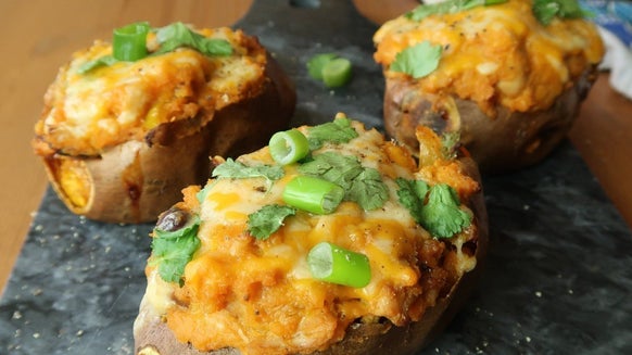 Stop het rijstmengsel in de aardappels en bedek het met kaas. Grill op hoog in de avond voor 5 minuten.