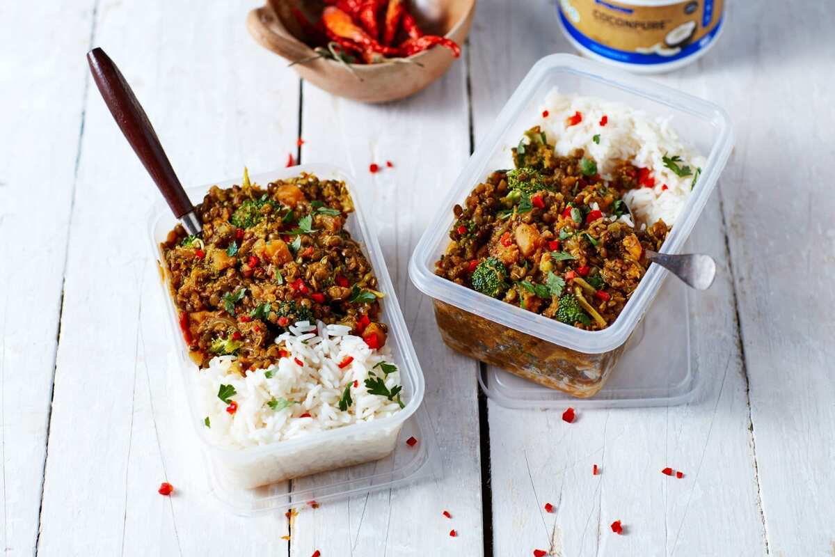 Bereid je lunch in batches van tevoren met dit smakelijke, veganistische, eiwitrijke linzendal recept. Vegan meal preppen was nog nooit zo makkelijk (en lekker..)