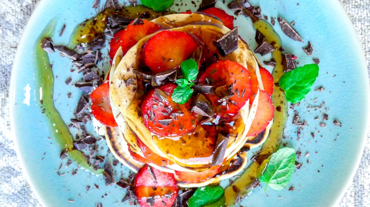 - Hak de chocolade in kleine stukjes. Ontdoe de aardbei van het kroontje en snij deze in dunnen plakjes. Stapel de pannenkoeken op en doe telkens wat plakjes aardbei tussen elke laag. Strooi de chocolade over de pancakes en voeg wat verse blaadjes munt toe. Giet als laatste de maple siroop over de pannenkoeken heen.