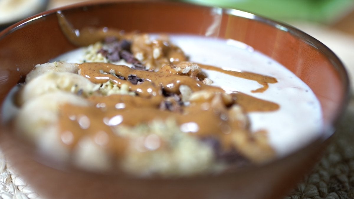 - Voeg het gladde geheel toe in een bowl en versier de power bowl met jouw favoriete toppings, zoals plakjes vers fruit, de Organic hemp super seeds, cacao nibs en een eetlepel smooth pindakaas.