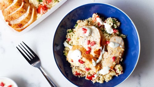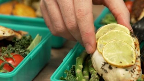 Verdeel het over in mealprep containers met gekookte volkoren quinoa als je ook een portie complexe koolhydraten wilt.