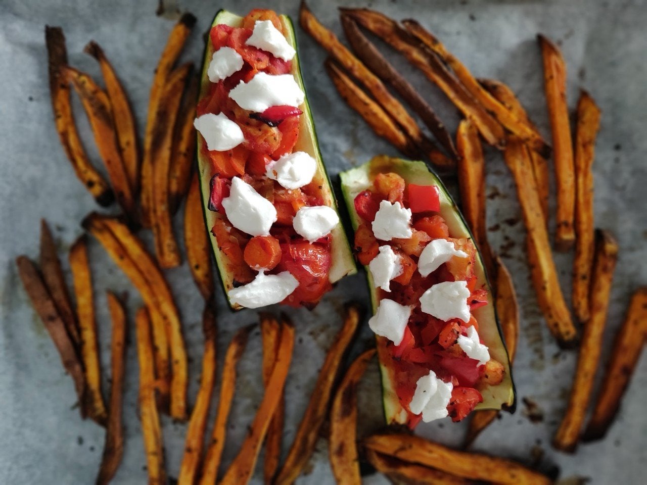 - Als het geheel goed verwarmd is, haal je de courgette uit de oven en vul je deze met het mengsel van groente en tomatenblokjes.