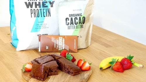 Voeg alle ingrediënten behalve de eiwitchocolade toe aan een keukenmachine en mix tot je een gladde browniebeslag krijgt. Afhankelijk van hoe rijp je bananen zijn, moet je misschien een scheutje melk aan de mix toevoegen als het te dik is.