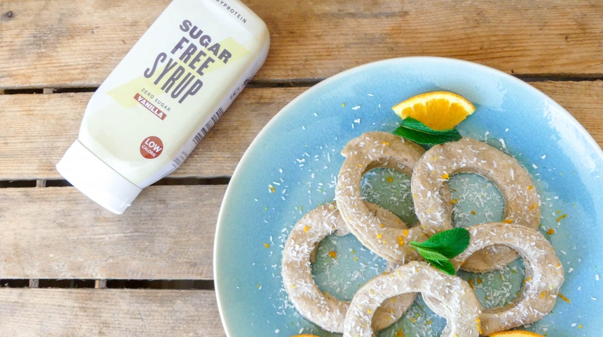 - Haal na de tijd de donuts uit de oven en giet er de suikervrije vanille siroop overheen. Strooi er als laatste wat kokosrasp en nog wat sinaasappelrasp overheen. Eet smakelijk!