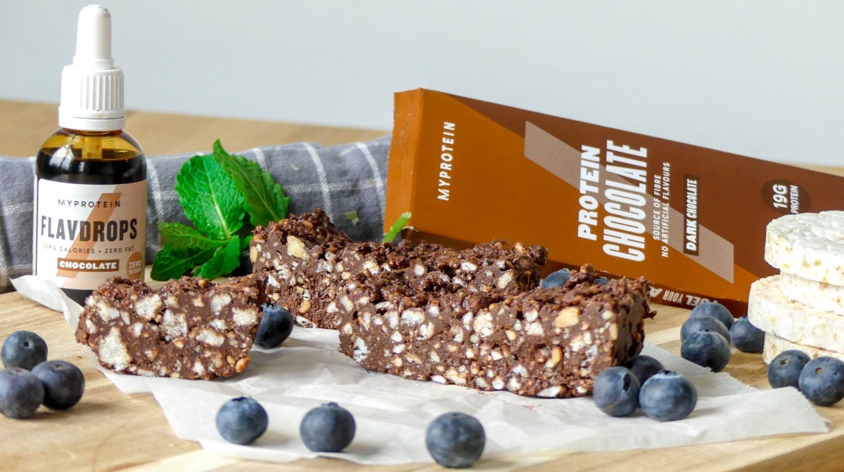 Kruimel de rijstwafels helemaal fijn en roer deze door het chocolade mengsel, zorg dat alle stukje rijstwafel bedekt zijn. Voeg ook nog de chocolade flavor drops toe voor de extra chocolade smaak.