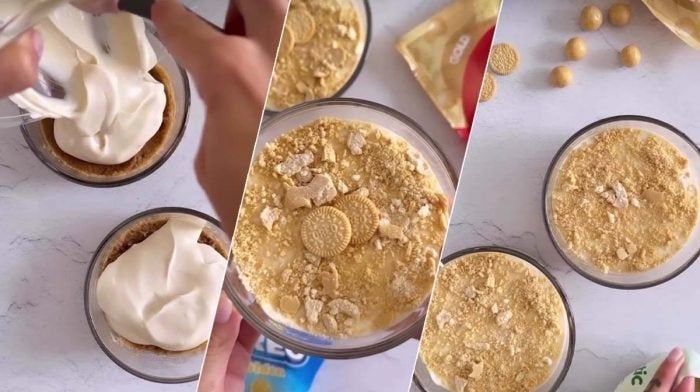 Plaats vervolgens de chocolademoutballen en vanille-sandwichkoekjes in een boterhamzakje en plet ze met een deegroller of de bodem van een mok. Als alternatief kun je zelfs gewoon je handen gebruiken.