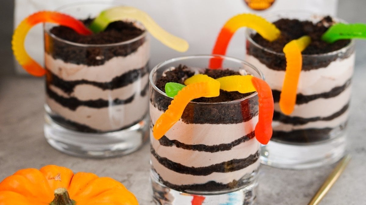 Nu is het tijd om te bouwen. Wissel lagen verkruimelde koekjes en yoghurtmix af in een glas in tumbler-stijl. Zorg ervoor dat de laatste laag gemaakt is van de verkruimelde koekjes, dit is de “modder” voor de wormen.