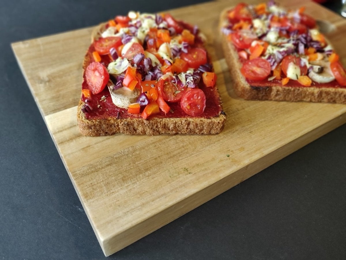 - Snijd de groenten, vleeswaren, vega opties etc. in stukjes en beleg je boterhammen (pizza toast) met je favoriete toppings.