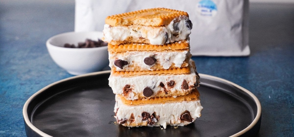 Daar stopt het echter niet. Flo heeft dit dessert naar een hoger niveau getild door het tussen twee koekjes te klemmen om de perfecte ijssandwich te creëren. Wij werden meteen teruggevoerd naar onze kindertijd...