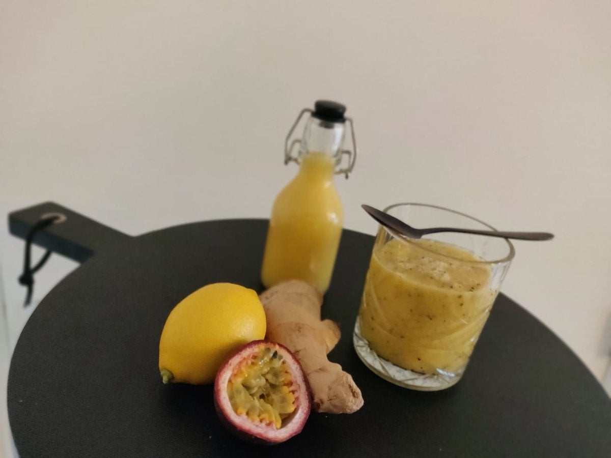 - Voeg de mango, het sap van een perssinaasappel, vrucht van de passievrucht en één gembershot toe in een blender.