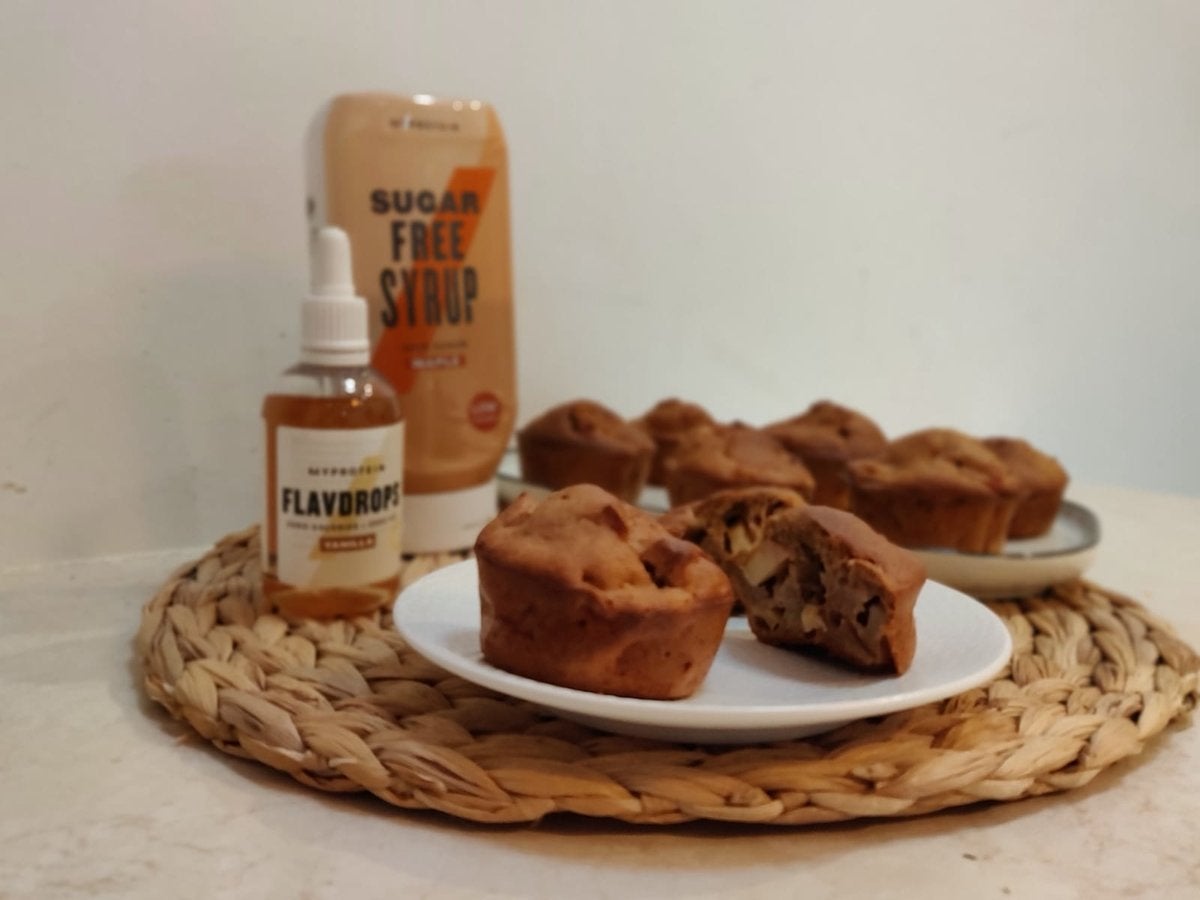 1. Verwarm de oven voor op 180 graden 2. Snijd de banaan in partjes en prak deze fijn. 3. Voeg de eieren, oat meal, bakpoeder, kaneel & de koek speculaas kruiden toe aan de bananen. 4. Mix dit geheel tot een gladde massa voor 3 minuten, zodat het beslag luchtig wordt. 5. Voeg de druppels Flavdrops en Maple syrup toe aan het gladde beslag en roer dit goed door. 6. Snijd de appel in kleine stukjes, strooi hier nog wat kaneel over en voeg deze toe aan het beslag. 6. Vet de muffin vormpjes in en voeg het beslag toe aan de vormpjes. 7. Zet de muffins voor 40 minuten in de voorverwarmde oven op 180 graden.