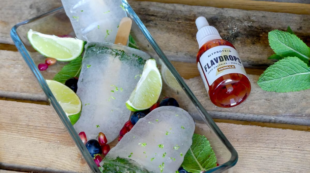 - Pak de ijsvormpjes en vul deze met water. Doe dit water vervolgens in een maatbeker en voeg de gesneden munt en de helft van rasp van de limoen toe. Pers de limoen vervolgens uit en voeg dit samen met wat druppels vanille flavor drops toe aan het water.