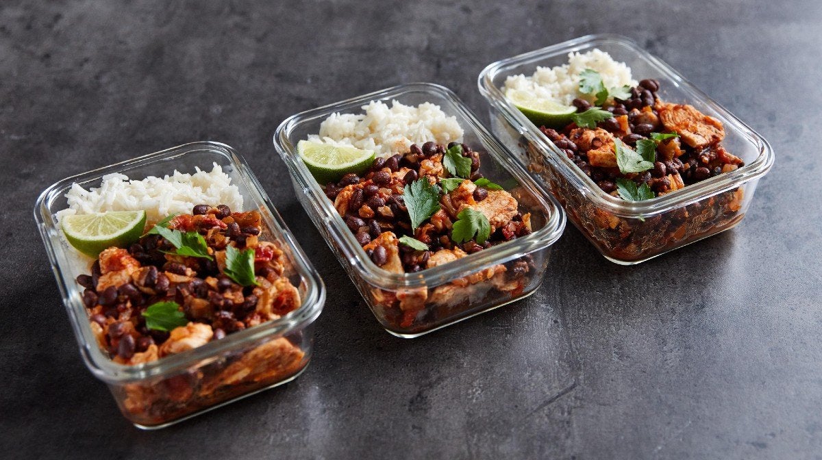 3. Voeg vervolgens de uitgelekte zwarte bonen en de salsa toe en meng goed om te combineren in de pan. Laat het een paar minuten koken en verdeel het dan met de gekookte rijst in je meal prep containers. Garneer met verse koriander en een partje limoen.
