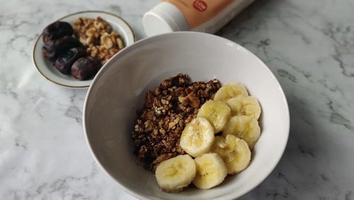 - Voeg daarna de dadels, gerapste wortel, walnoten en de helft van de kokosrasp toe in een keukenmachine (een blender werkt het fijnst). V