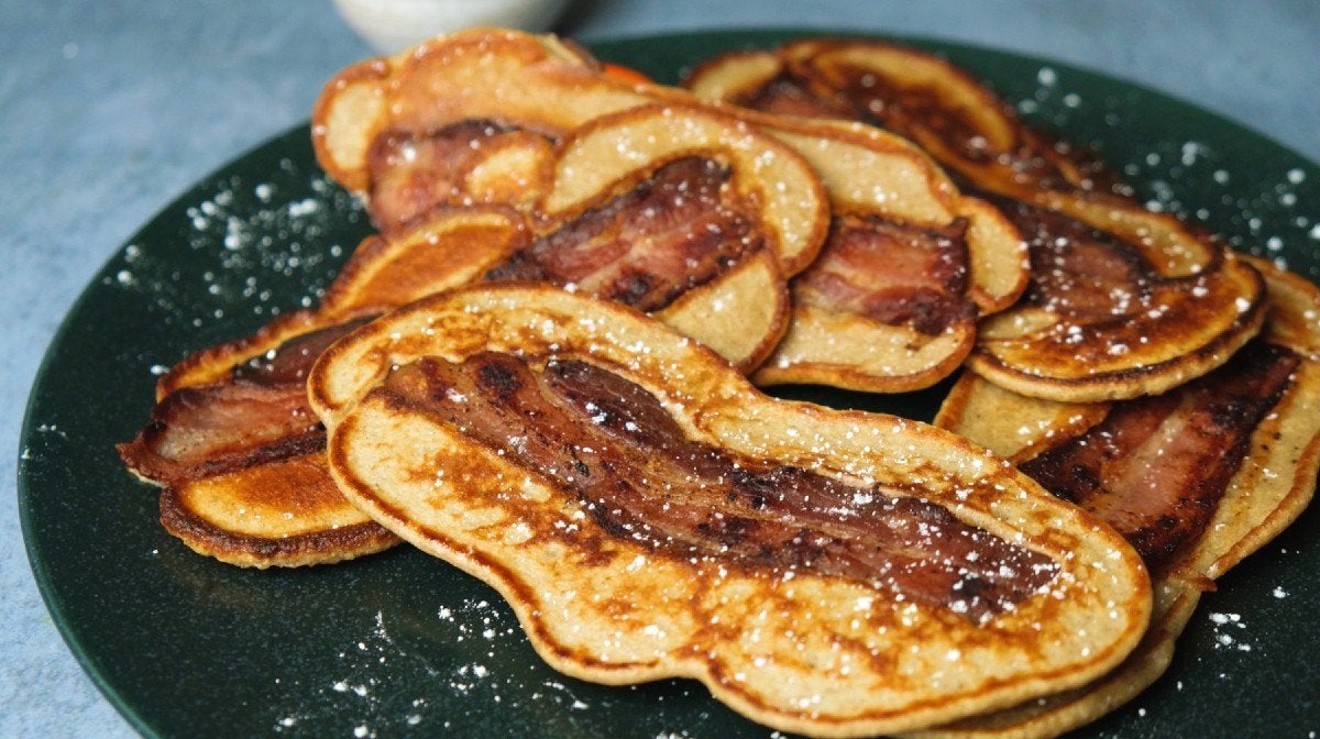 Herhaal dit proces totdat al het spek en pannenkoekenmengsel is gebruikt. Bestrooi met een beetje poedersuiker en doop in een hele lading Suikervrije Siroop. Mind blown.