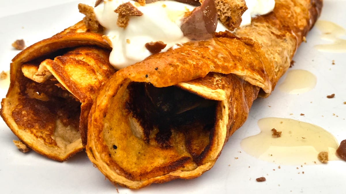 Zijn je pannenkoeken klaar? Dan is het tijd om ze op te rollen en ze af te toppen met de magere kwark. Snijd de chocolade kruidnoten fijn en verkrummel deze over je pannenkoeken. Last but not least doe je een beetje mysyrup over je Speculaas Pannenkoeken en je hebt een mega lekker Sinterklaas ontbijtje!