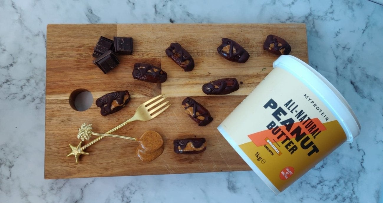- Snijd de dadel open en vul deze met ½ eetlepel Natuurlijke peanut butter smooth Myprotein. Doe dit bij alle dadels.