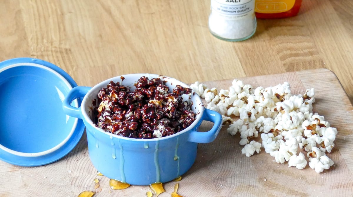 - Gooi de popcorn in een schaal en giet de chocolade er overheen. Roer alles door elkaar. Doe de popcorn in een nieuw kommetje. Strooi wat zout over de popcorn en giet er als laatste een beetje honing overheen. Geniet van je sweet & salty popcorn!