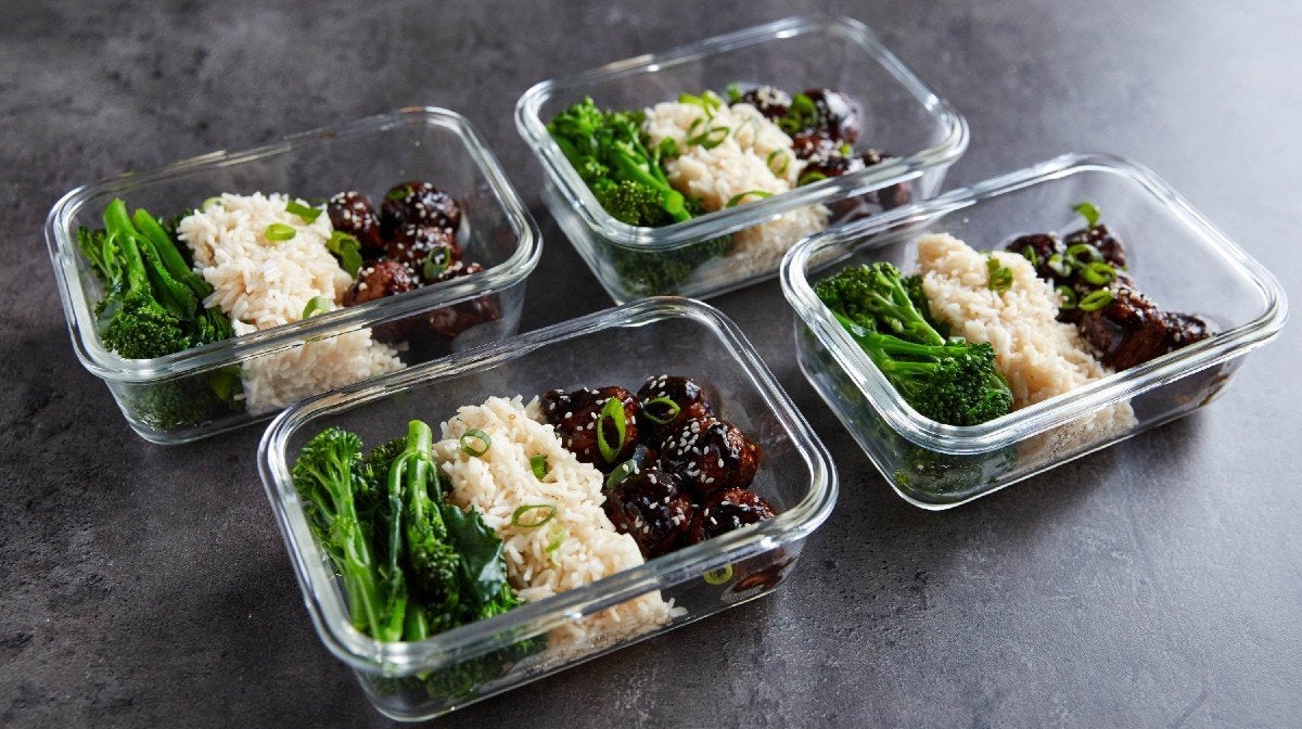 7. Voeg in vier meal prep containers de broccoli, rijst en een portie gehaktballen toe. Garneer met sesamzaadjes en gesnipperde lente-uitjes.