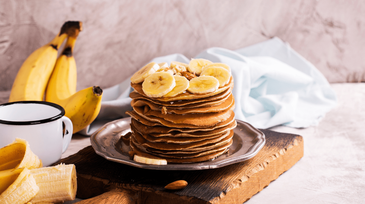 - Stapel je pannenkoeken op elkaar en voeg eventuele toppings naar keuze toe. We raden plakjes banaan en veel ahornsiroop aan. Werk af met gehakte noten om je eiwitinname te verhogen.