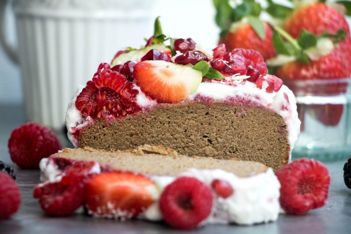 6. Om de bessen te laten druppelen, verwarm je de frambozen zachtjes in een pan en roer je 1-2 theelepels siroop erdoor. Als de bessen mooi gesmolten zijn, sprenkel je de saus over de bovenkant van het bananenbrood en laat je het doorweken.