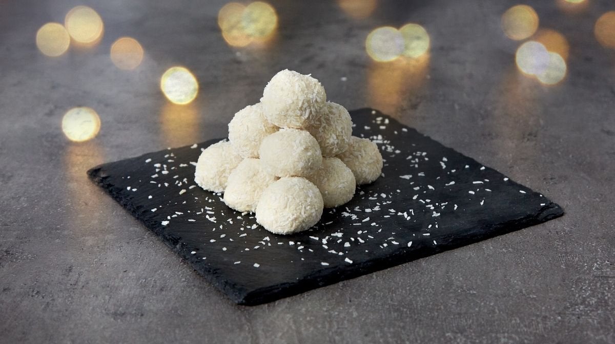 3) Rol elke bal rond een kom gedroogde kokosnoot, totdat deze volledig is bedekt met de kokosnoot.