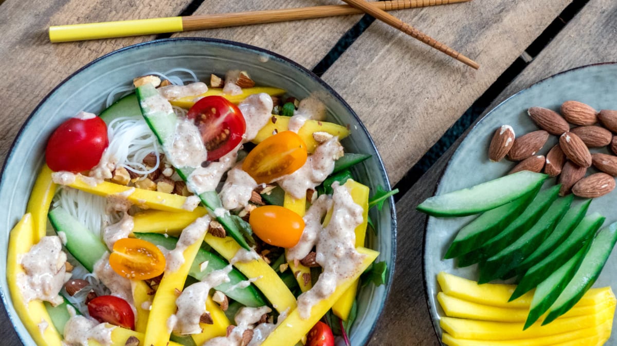 De tijd van lekkere salades eten is weer aangebroken! Deze frisse zomerse salade heeft wat Aziatische tinten. Zo is de combinatie van rijstvermicelli, sla en mango heel erg lekker. In plaats van dressing hebben we de Myprotein crunchy pindakaas gebruikt. Pindakaas wordt natuurlijk veel in Nederland gegeten, maar geeft het toch weer een beetje een Aziatische smaak. De amandelen geven de salade ook nog een beetje extra crunch.