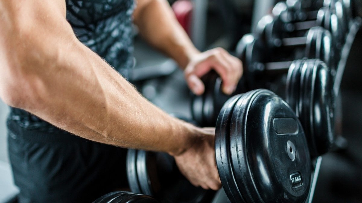 - Je handen zullen rusten en de dumbbells vasthouden