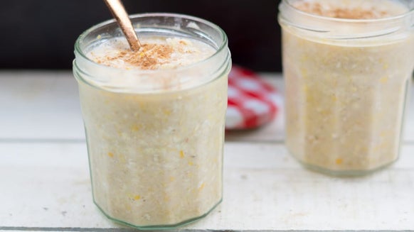 - Overnight oats - ouderwetse havermout gedrenkt in yoghurt of melk met chiazaden en bevroren bessen (maak af met pinda of amandelboter)